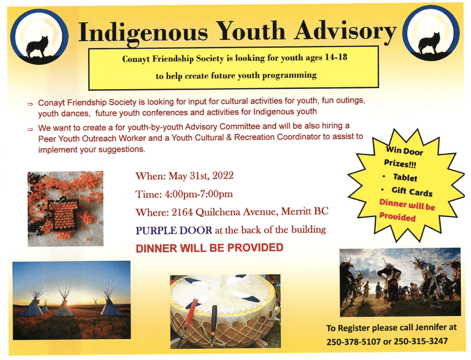 Conayt News and Events · May 09, 2022 Indigenous Youth Advisory Committee The Conayt Friendship Society is looking for indigenous youth to help us plan future programming for youth. Join us on May 31st from 4-7 pm at the Conayt Office. All information is in the image, or download it below. Youth Advisory poster 2022.pdf Adobe Acrobat Document 128.0 KB Download tagPlaceholderTags: