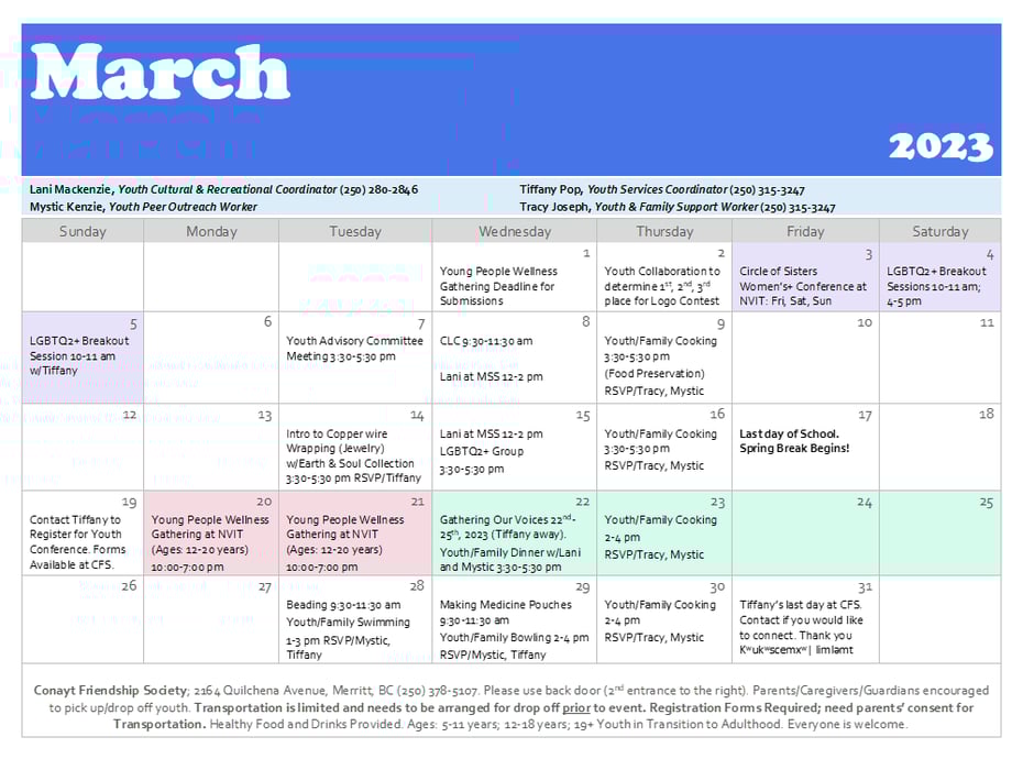 Conayt News and Events · March 01, 2023 Youth Services March 2023 Download the Schedule CFS Youth Services Calendar, March 2023. Portable Network Image Format 84.8 KB Download tagPlaceholderTags: