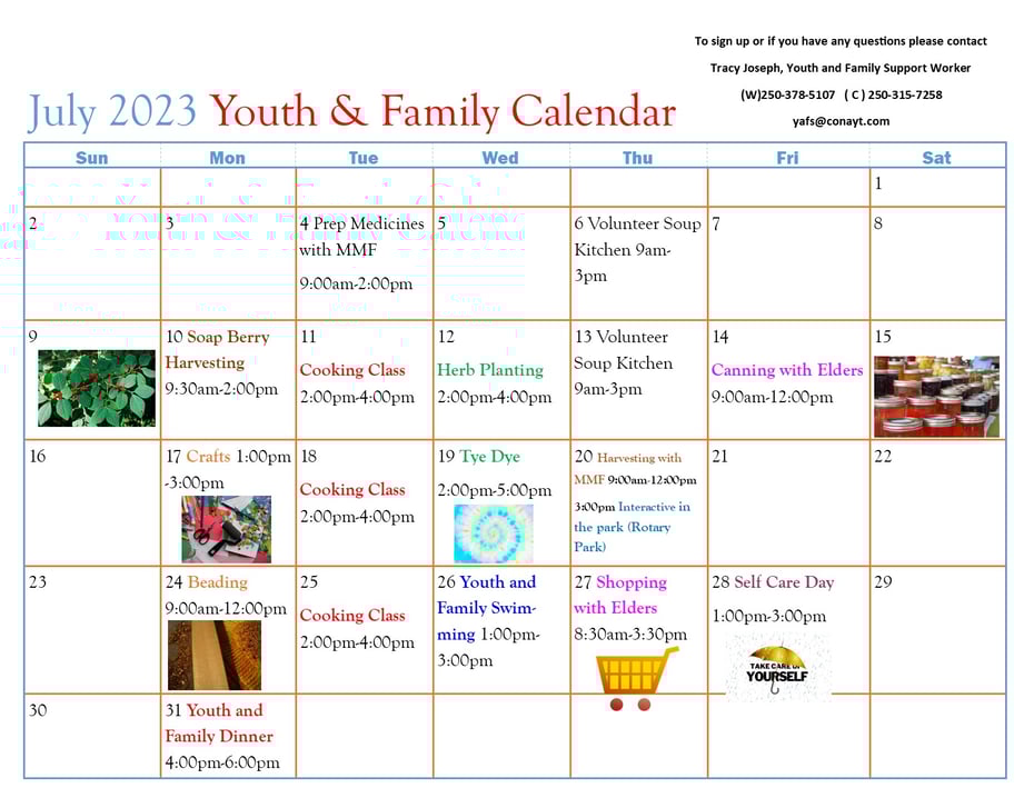 If you have any questions or would like to sign up, please contact our youth and family support worker Tracy Joseph at 250-378-5107 or by email at yafs@conayt.com